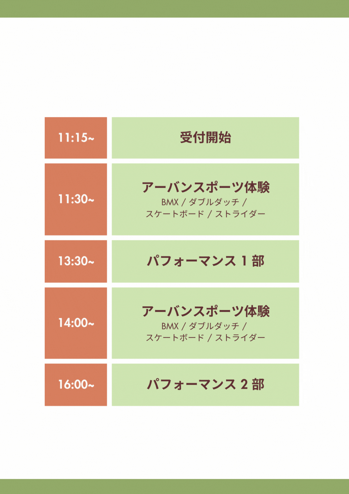 A: 体験参加の受付については以下の通りです。なお、混雑状況によっては、受付を予定より早く終了する場合がございます。事前にお申し込みいただいても、参加できない可能性がございますので、お早めにお越しくださいますようお願いいたします。