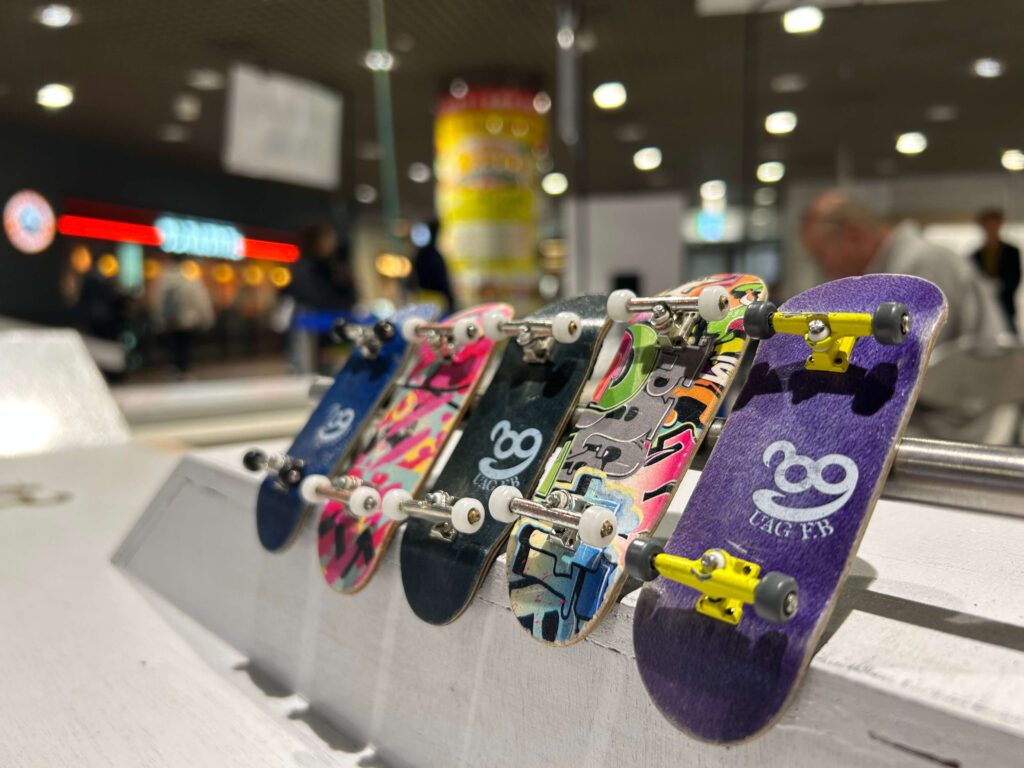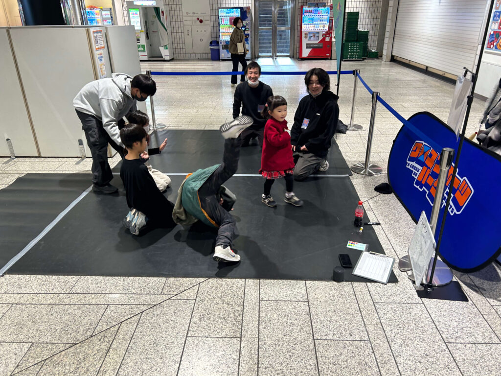 入口には気軽に触れられる「指スケ」や「けん玉」を配置し、興味を持った方にそのまま奥の「ブレイキン」へ進んでもらえる動線設計に。
